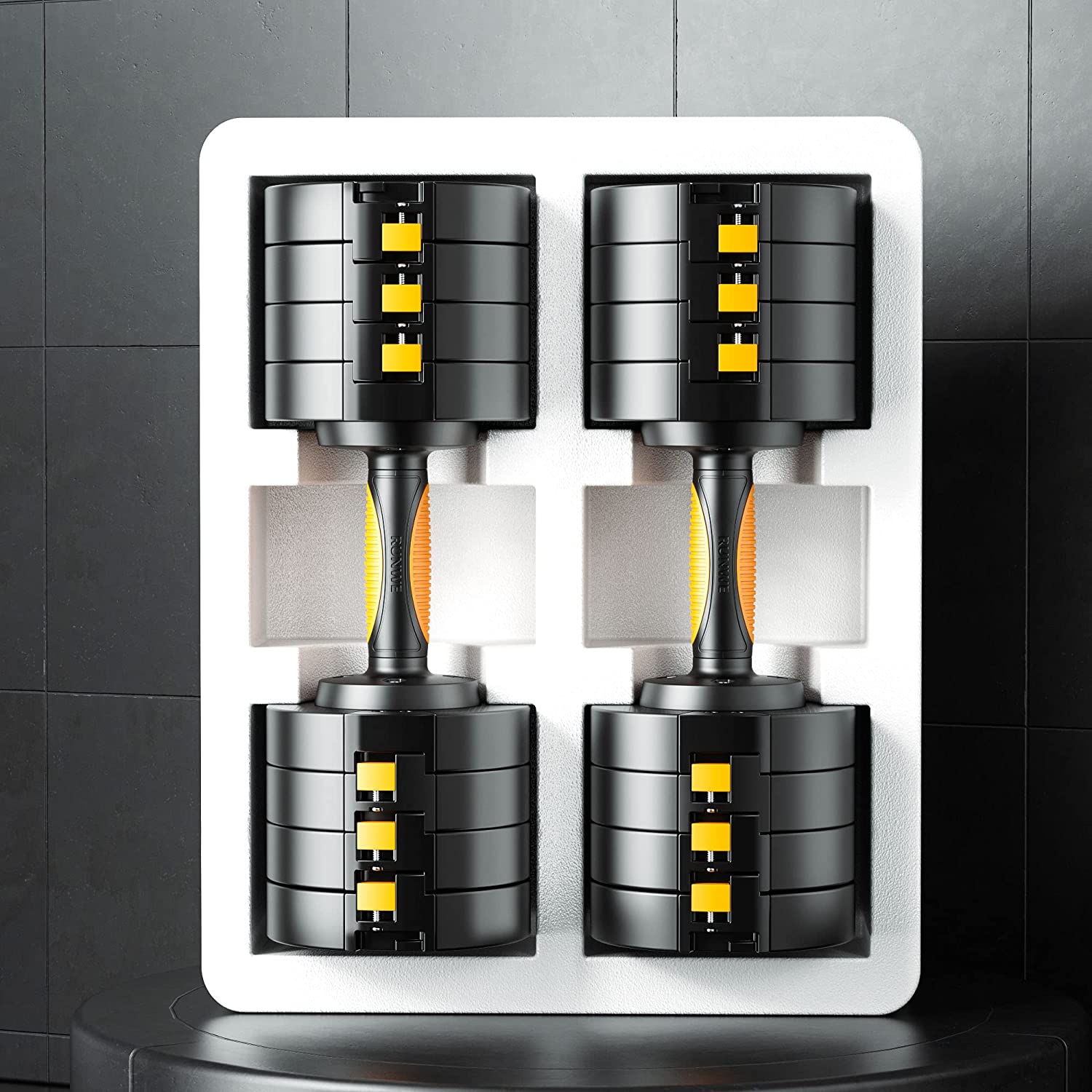 • RESIZABLE AND SPACE SAVER: Our weight plates have steel sheets inside to ensure an accurate weight, a compact size, and reliable quality. What’s more, conventional adjustable dumbbells always have their fixed-length handlebars sticking out. Ours, however, change the size according to the weight.
